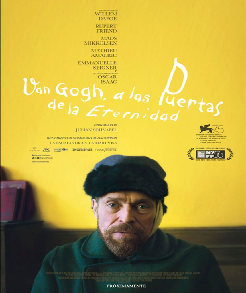 Hemos recibido, de los amigos de la distribuidora Diamond Films España, el tráiler y el cartel de su película Van Gogh, a las Puertas de la Eternidad. Dirigida por Julian Schnabel, está protagonizada por Willem Dafoe (en el papel del genial pintor), Rupert Friend, Oscar Isaac, Mads Mikkelsen, Mathieu Almalric y Emmanuelle Seigner, entre otros. El film se centra en el tiempo que el pintor pasó en Arles y en Auvers-sur-Oise, en Francia.