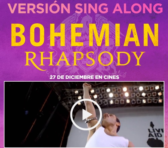 Los amigos de la distribuidora Hispano Foxfilm nos informan que mañana, 27 de diciembre, se proyectará su película Bohemian Rhapsody (que tuvo su estreno comercial a últimos de octubre pasado) en versión Sing Along. Es decir que todas las canciones estarán subtituladas, ¡cómo si fuese un karaoke!, para que los espectadores que lo deseen canten las canciones en la sala de cine.