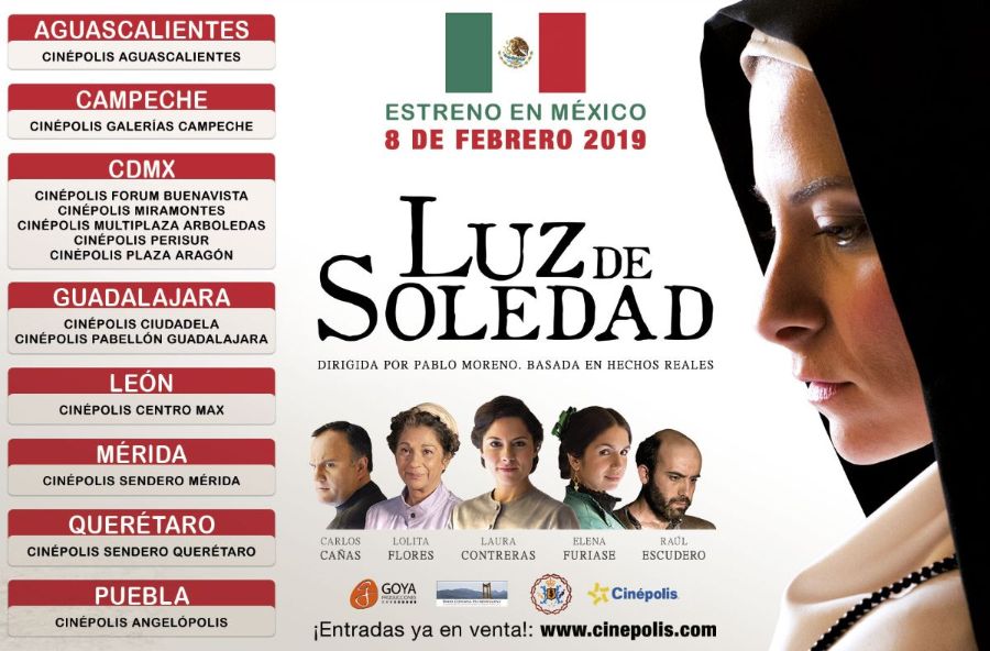 Los amigos de Goya Producciones nos informan que su película Luz de Soledad se estrenará en los cines de México el próximo 8 de febrero. Dirigida por Pablo Moreno, el film ha obtenido numerosos galardones en los diveros certámenes a los que acudió en Europa y América, entre ellos el Premio Bravo a la mejor actriz para la protagonista Laura Contreras., que da vida a la santa y fundadora española Soledad Torres Acosta. En el reparto también podemos ver a Lolita Flores, Elena Furiase (hija en la vida real de Lolita), Carlos Cañas, Raúl Escudero, Eva Higueras, Julio Lázaro y Susana Sucena .
