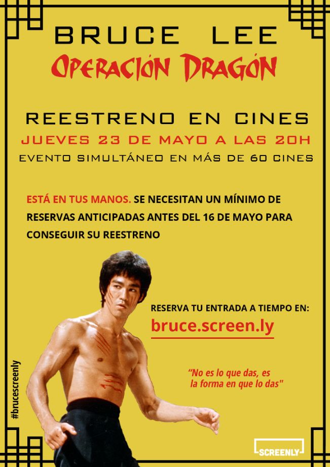 Con el innovador sistema bajo demanda de Screenly, el público puede conseguir que sus películas favoritas lleguen a los cines de sus ciudades. Así, si el 16 de mayo (1 semana antes de la fecha de los eventos) se han reservado las entradas suficientes se irán confirmando las proyecciones en cada ciudad, hasta llegar a más de 60 cines de todo el territorio español. Los fans de Bruce Lee, de las artes marciales y, en definitiva, los fans del cine vivirán una noche única e inolvidable gracias a su capacidad de movilización.