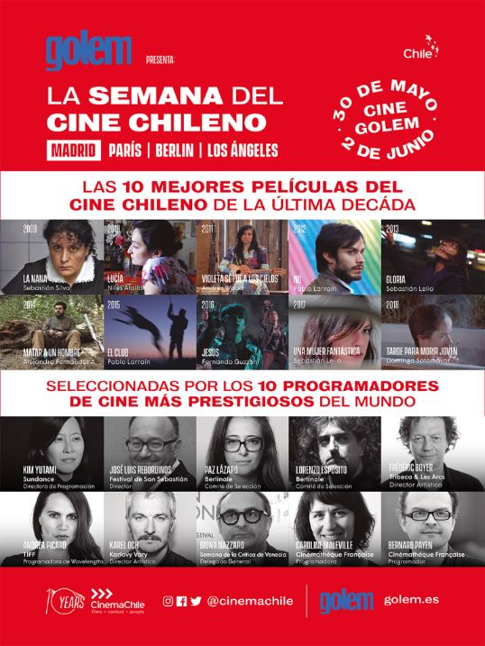 Del jueves 30 de mayo al domingo 2 de junio, se va a celebrar en los cines Golem (C/ Martín de los Heros, 14), de Madrid, la Semana del Cine Chileno. Se proyectarán las 10 mejores películas chilenas de los últimos 10 años, que han sido elegidas por 10 grandes programadores del cine mundial, para conmemorar los 10 años de CinemaChile (organismo que promociona internacionalmente el cine chileno en todo el mundo). Este homenaje al cine chileno también se celebrará en las ciudades de París, Berlín y Los Ángeles.