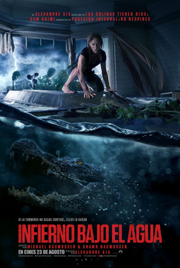 Sinopsis: Cuando un enorme huracán llega a su pueblo en Florida, Haley (Kaya Scodelario) ignora las órdenes de evacuación para encontrar a su padre desaparecido (Barry Pepper). Tras encontrarle gravemente herido en el entresuelo de su casa, los dos quedan atrapados por la inundación que cubre rápidamente el terreno. Prácticamente sin tiempo para escapar de la tormenta que arrecia, Haley y su padre descubren que la subida del nivel del agua es el menor de sus problemas.