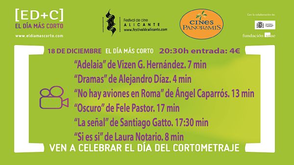 El próximo día 18 de diciembre (miércoles), el Festival de Cine de Alicante celebrará la séptima edición de ‘El día más corto‘. La cita será en los cines Panoramis a las 20:30 horas. El precio de la entrada es de 4 euros, proyectándose seis cortos.