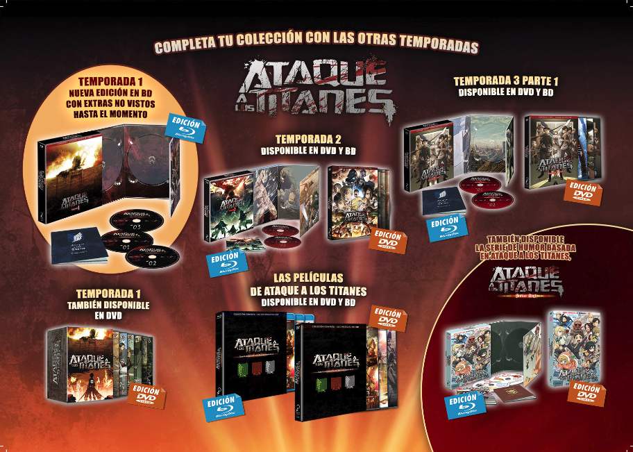 Puedes completar tu colección con varias temporadas y las películas de Ataque a los titanes (En Blu-ray y DVD).