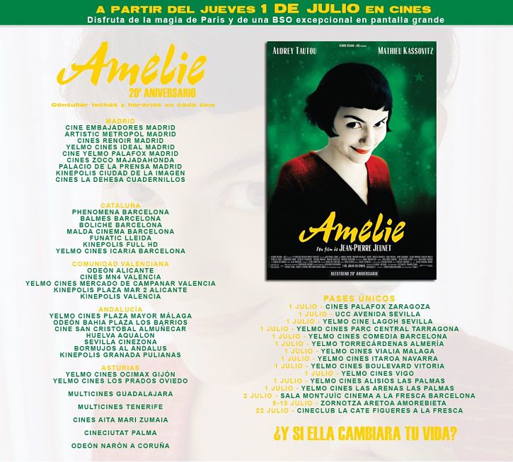 A continuación puedes consultar las ciudades y cines donde se reestrena Amelie