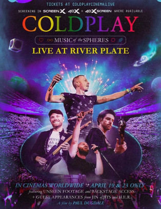 La distribuidora Versión Digital estrena hoy, 19 de abril, y el próximo domingo, 23 de abril, en cines, el espectacular concierto del grupo Coldplay en Argentina, que tuvo lugar a finales del año pasado. Más de 100 salas de 90 localidades españolas podrán disfrutar de este acontecimiento que tuvo lugar en el River Plate, encuadrado en la gira Coldplay Music of the Sheres. Consulta AQUÍ las proyecciones.