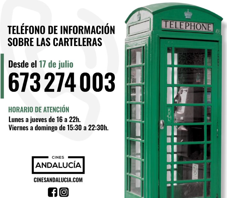 Desde el pasado 17 de julio esta funcionando el teléfono 673 274 003 que atiende las consultas de usuarios sobre cartelera, tarifas y servicios que ofrece la red CINES DE ANDALUCÍA. Este servicio se ha hecho posible gracias a la colaboración entre CINES ANDALUCÍA y la ONCE. El servicio está atendido por personas con discapacidad visual.