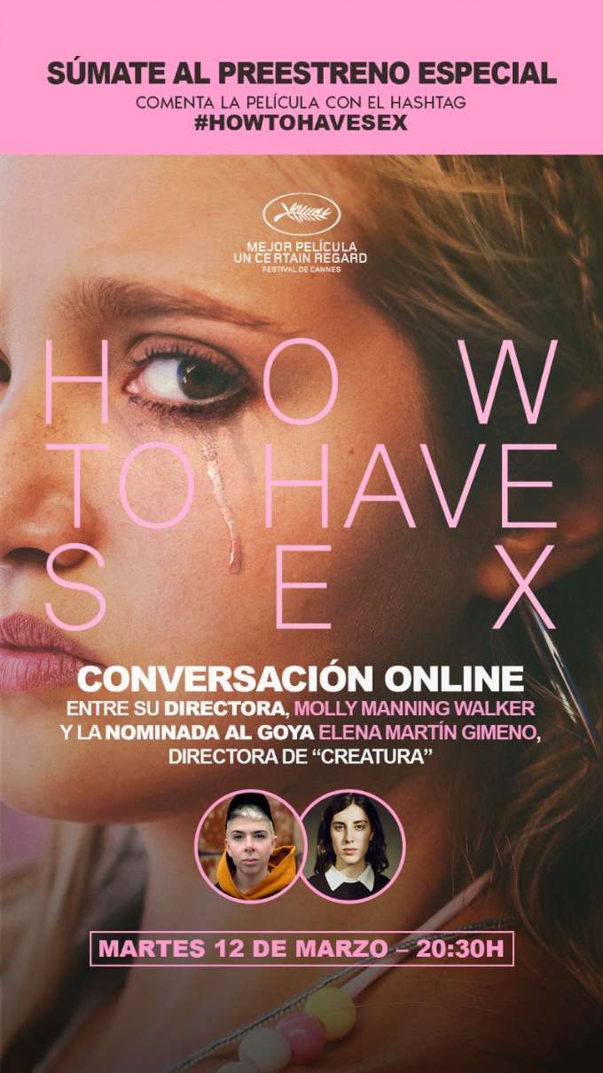La distribuidora Avalon ha organizado un preestreno especial de How to Have Sex el próximo 12 de marzo a las 20:30 horas (el estreno comercial será el 15 de marzo) y un posterior coloquio online con las cineastas Molly Manning Walker (directora de How to Have Sex) y Elena Martín Gimeno (directora de Creatura). El evento se podrá seguir en más de 30 cines de toda España, BUSCA EL TUYO Y RESERVA AQUÍ