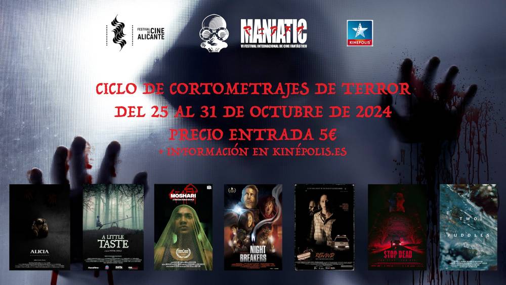 Del 25 al 31 de octubre próximos se van a proyectar siete cortos de terror, en los cines Kinépolis del Centro Comercial Plaza Mar 2, de Alicante. Esta iniciativa es del Festival Internacional de Cine de Alicante junto al Festival Internacional de Cine Fantástico de Valencia (Maniatic Film Festival) para celebrar Halloween.