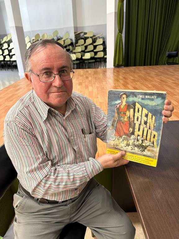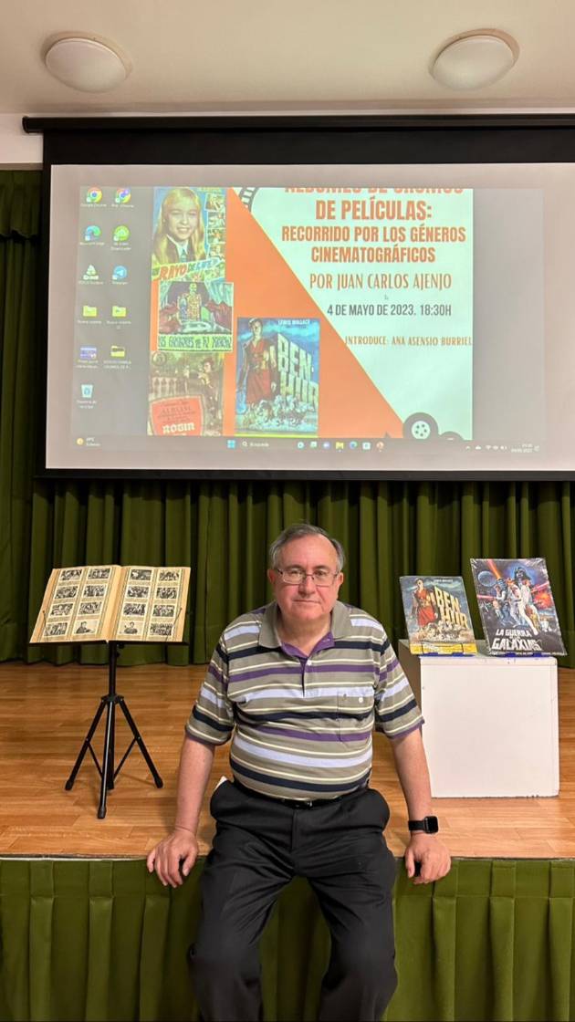 En las fotos que acompañan la entrada podemos ver a Juan Carlos Ajenjo (que nos ha cedido gentilmente las imágenes) en diferentes charlas y con el álbum de la película BEN-HUR (una de sus películas favoritas).