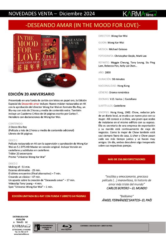 Ya se encuentran disponibles, a la venta, los lanzamientos que Karma Films Video ha sacado al mercado para este mes, tanto en Blu-ray y/o DVD. Distintos títulos para que los cinéfilos puedan completar sus colecciones o adquirir esa película estaban buscando, y con más motivo por la cercanía de las fiestas navideñas. Además, como siempre, para complementar las películas, los DVD y Blu-ray llevan unos contenidos adicionales, que hacen más interesante adquirir cualquiera de estas películas. En esta ocasión, entre los lanzamientos podemos encontrar Deseando amar (en una cuidada edición de coleccionista) y Fernando Fernán Gómez (Volumen 2) (con otra selección de 5 títulos de su filmografía).
