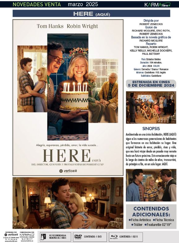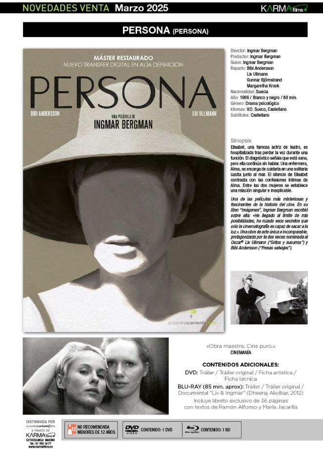 Ya se encuentran, en venta, los lanzamientos que Karma Films Video ha sacado al mercado este mes, tanto en Blu-ray y/o DVD. Diferentes títulos para que los cinéfilos puedan completar sus colecciones o adquirir esa película que estaban buscando. Además, como siempre, para complementar las películas, los DVD y Blu-ray llevan unos contenidos adicionales, que hacen más interesante adquirir cualquiera de estas películas. En esta ocasión, entre los lanzamientos podemos encontrar Persona (una película de Ingmar Bergman) y un original historia protagonizada por Tom Hanks y Robin Wrght Here (Aquí).