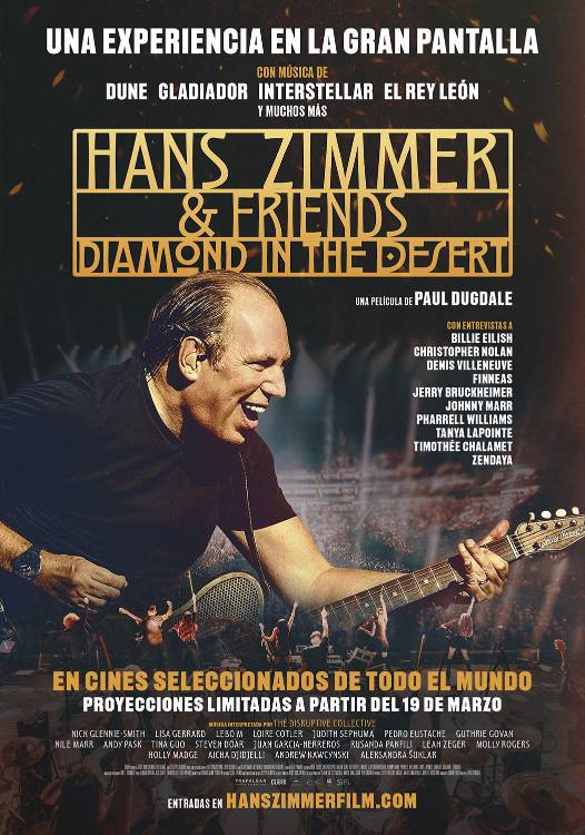 Sinopsis: Hans Zimmer & Friends: Diamond in the Desert presenta una extraordinaria experiencia en vivo, donde algunas de las composiciones más icónicas de Zimmer cobran vida. Con música de Dune, Gladiator, Interstellar, El Rey León y mucho más, esta producción rinde homenaje a décadas de obras maestras cinematográficas. Acompañado por su banda y una orquesta de clase mundial, Zimmer transforma el icónico Coca-Cola Arena de Dubái, junto con otros escenarios, en una celebración única de sus bandas sonoras más queridas. Desde las majestuosas dunas del desierto árabe hasta las alturas del Burj Al Arab, cada actuación ofrece una experiencia íntima e inolvidable.