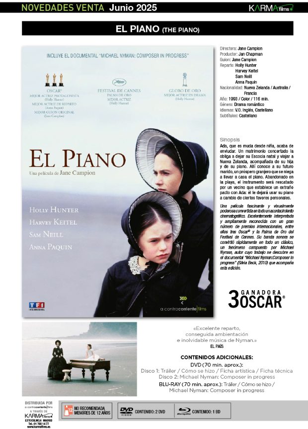Ya están disponibles, en venta, los lanzamientos que Karma Films Video ha sacado al mercado este mes, tanto en Blu-ray y/o DVD. Variedad de títulos para que los cinéfilos puedan completar sus colecciones o adquirir esa película que estaban buscando. Además, como siempre, para complementar las películas, los DVD y Blu-ray llevan unos contenidos adicionales, que hacen más interesante adquirir cualquiera de estas películas. En esta ocasión, entre los lanzamientos, podemos encontrar Paris, Texas (obra maestra de Wim Wenders) y El piano (delicia de Jane Campion que ganó tres Oscar®).