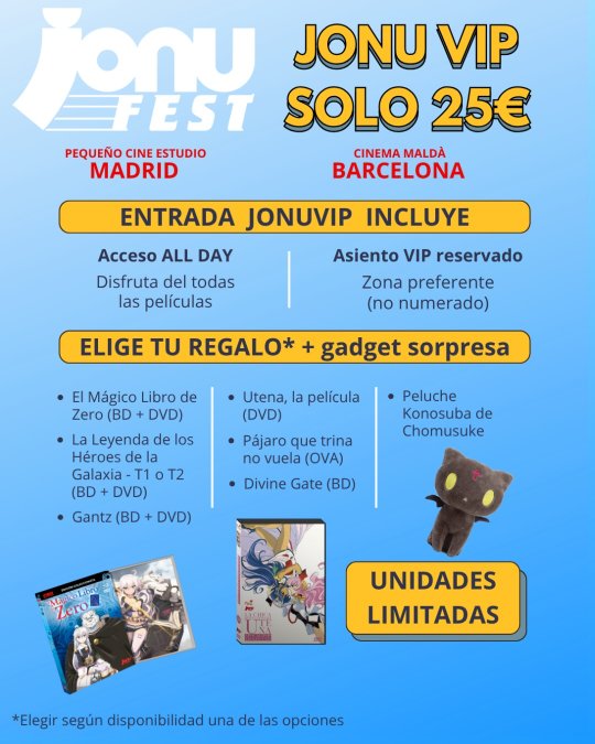 El festival de anime JONUU FEST, en VOSE y VE, trae en su cuarta edición las mejores películas del género, que por primera vez se va a celebrar en cines. Será los próximos 9 y 23 de mayo (en Barcelona y Madrid respectivamente) donde se podrán ver cinco títulos emblemáticos de este género con miles de seguidores. Además, los asistentes con su entrada (que puede ser individual para una sesión o sacar pase VIP -para todos los títulos-) recibirán una postal exclusiva de regalo.